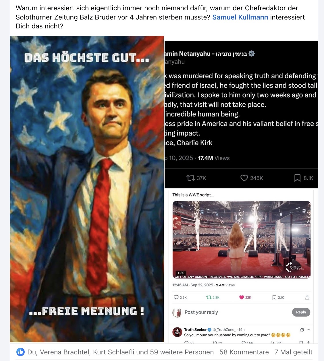 Während die christlich-zionistischen Fundis hierzulande und die noch zahlreicheren Anhänger des nethanjahuanischen Neokonsblatt WELTWOCHE Charlie Kirk als Märtyrer glorifizieren, stellt der pensionierte Arzt und Binder-Verbündeter Walter Siegrist aka Real Wsiegrist die richtigen Fragen: